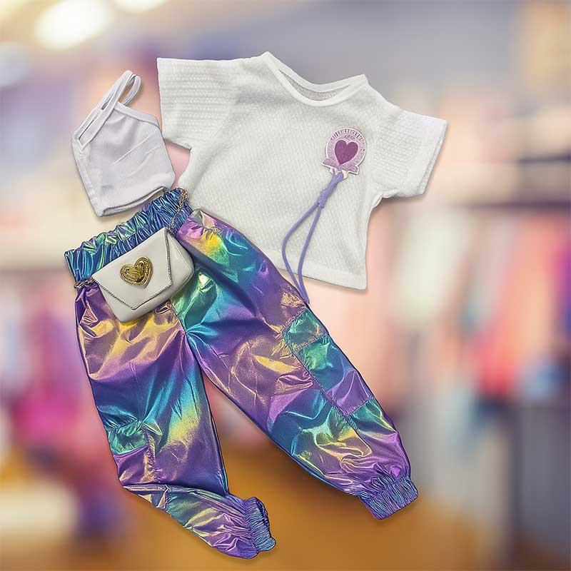 Outfit llamativo con pantalón efecto arcoíris y jaladera 3D.